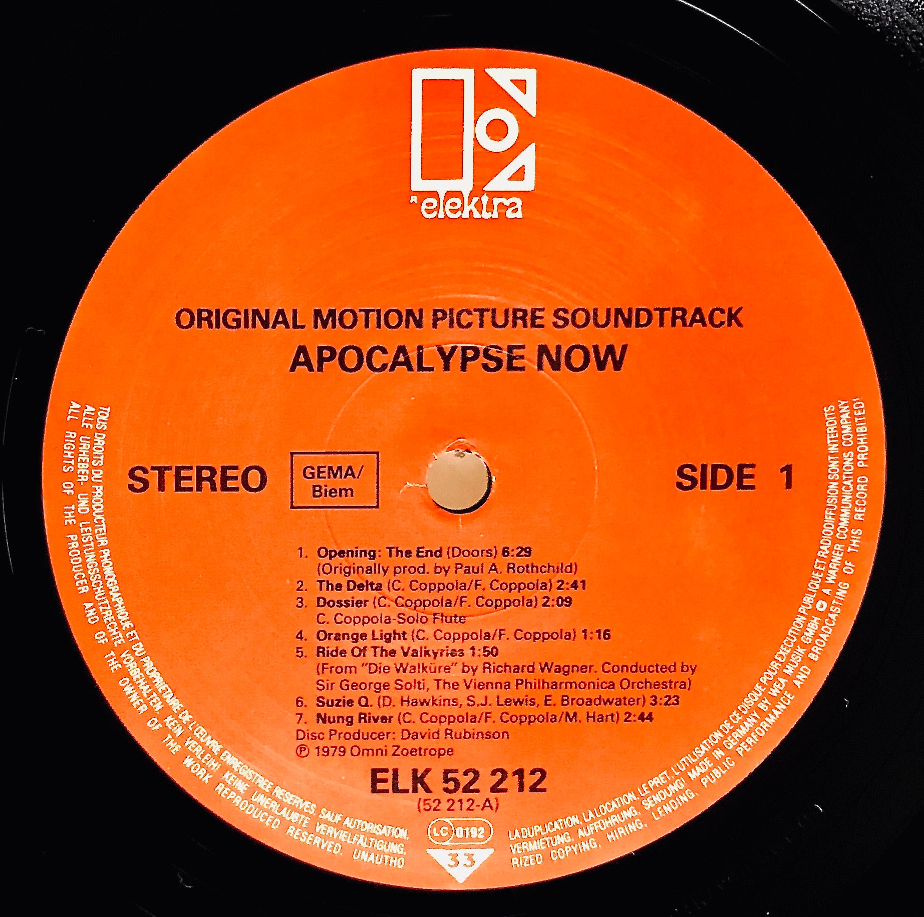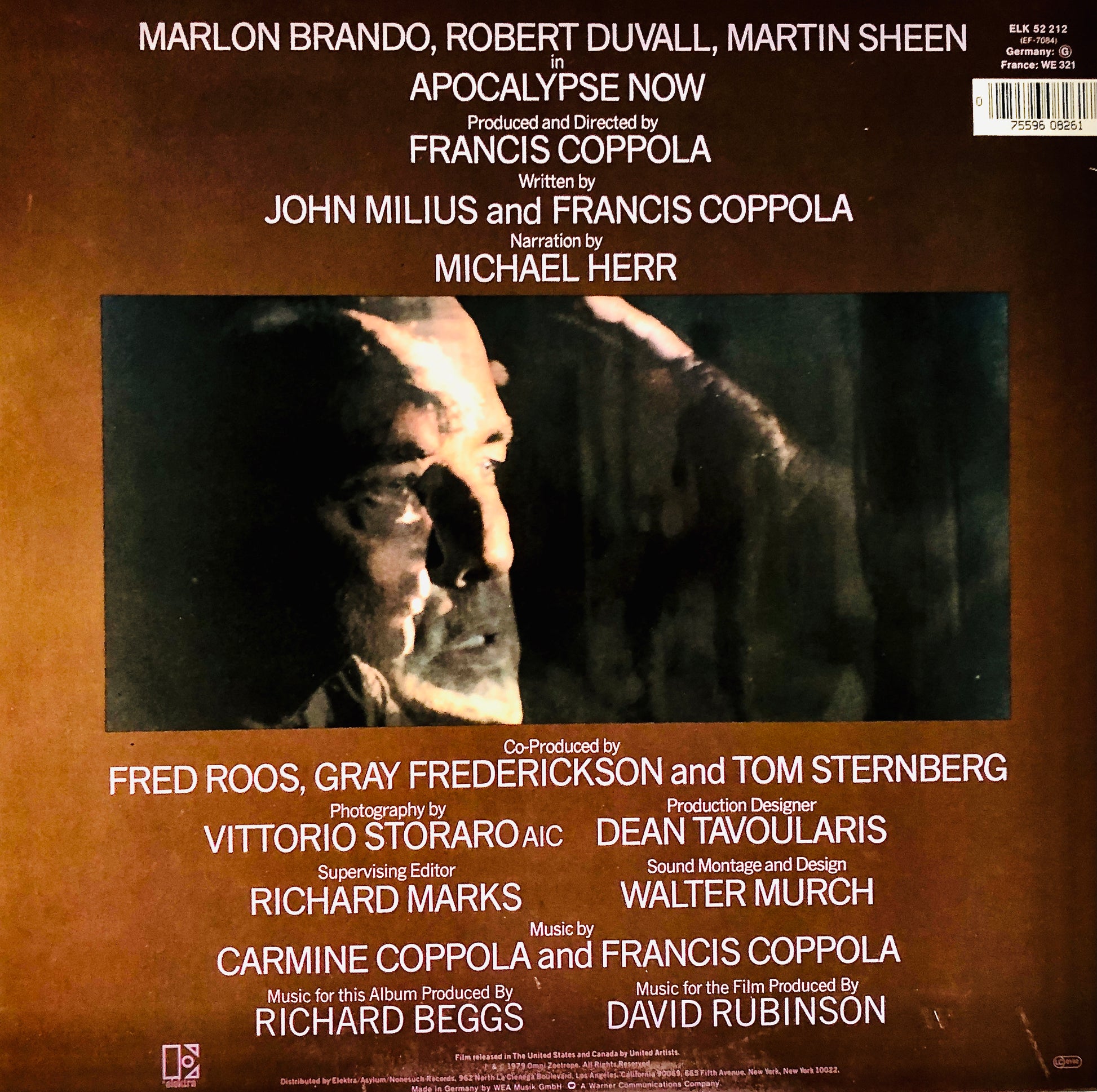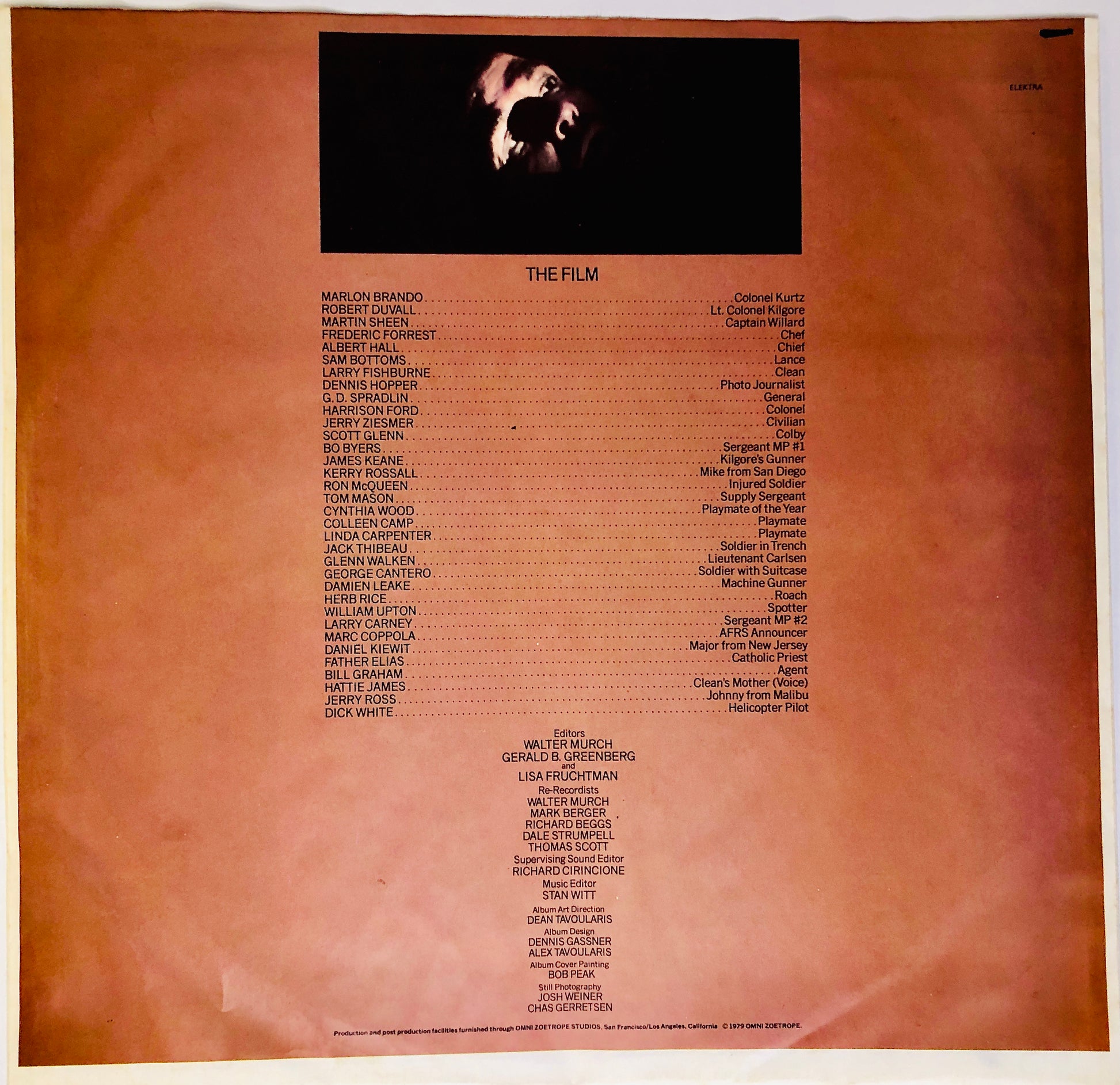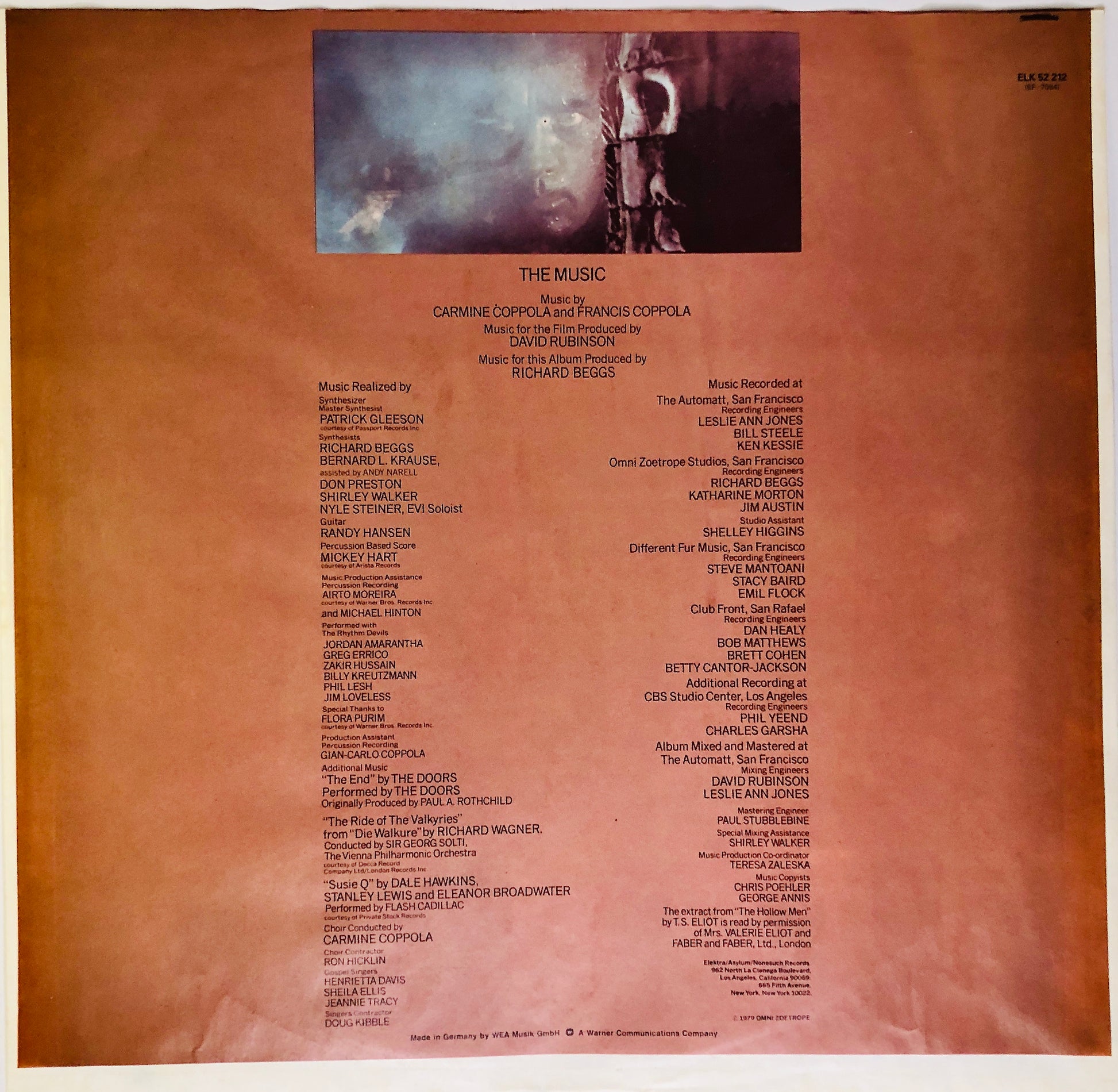 L'ululato del Criceto: “Apocalypse Now” è un film del 1979 diretto da Francis Ford Coppola. Liberamente ispirato al romanzo di Joseph Conrad, Cuore di tenebra, il film vinse la Palma d’oro al 32º Festival di Cannes e il premio oscar per la migliore fotografia a Vittorio Storaro e quello per il miglior sonoro a Walter Murch. Considerato tra i film sulla guerra del Vietnam più celebri di sempre, “Apocalypse Now” è una vivida rappresentazione dell’insolubile dilemma morale costituito dalla guerra; dilemma incentrato, in questa pellicola, sulle figure del colonnello Walter Kurtz (Marlon Brando) - un disertore, il quale, sommariamente, dovrebbe incarnare il male, la follia e la devianza - e del capitano Benjamin Willard (Martin Sheen) - un sicario, al quale spetta, genericamente, la personificazione del bene, del raziocinio e del rispetto delle “regole”. Tuttavia, lo sviluppo del film suggerisce almeno una parziale ricollocazione di queste due figure e dei valori da esse rappresentati, nonché una seria discussione sulla difficoltà umana di separare nettamente il bene e il male, la follia e il raziocinio, la norma e la ribellione. La canzone “The End” dei The Doors è indissolubilmente legata a questo film, in quanto presente nella scena iniziale, dove viene introdotta dal suono rallentato e riverberato delle pale di un elicottero, e nella scena finale, che culmina con l’uccisione di Kurtz. Diversi passaggi musicali espressamente composti per sottolineare alcune scene, portano la firma dello stesso Francis Ford Coppola e del padre Carmine, apprezzato compositore, direttore d’orchestra e musicista. Versione rara in vinile nero.