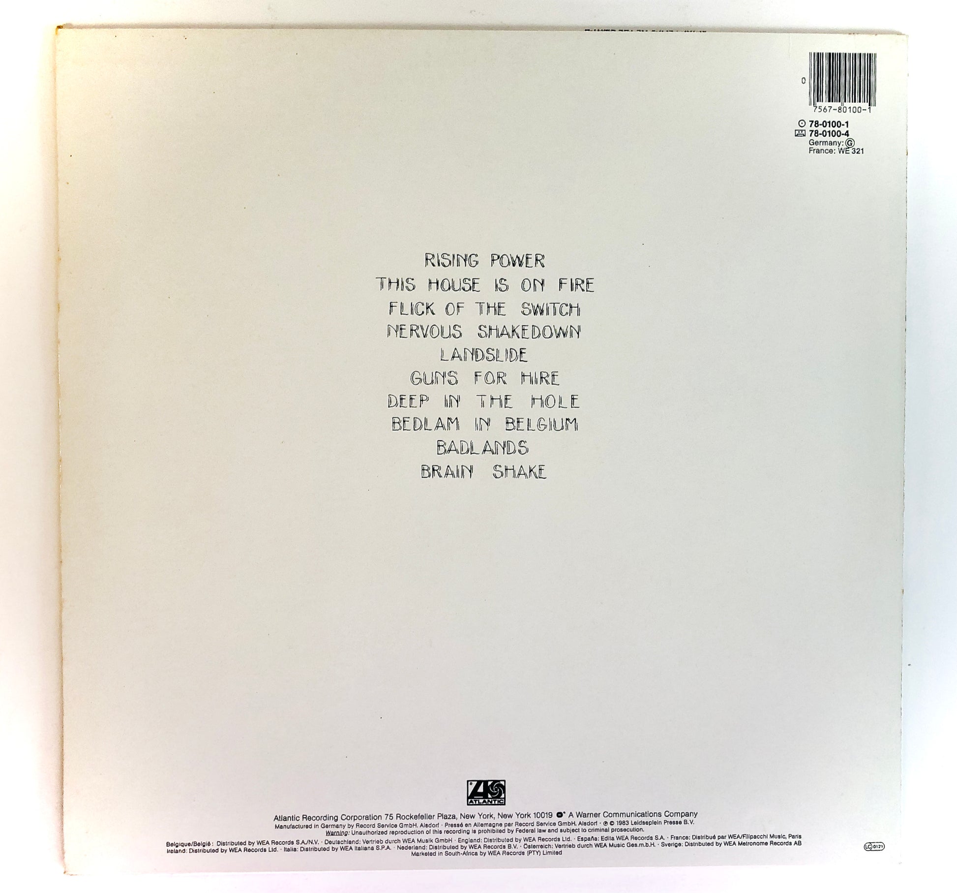 Catalogo (Catalog): 7567801001 (matrice / runout side A, R/S Alsdorf 780100-1 A ARUN; side B, R/S Alsdorf 780100-1 B ARUN) (Atlantic - 1983)