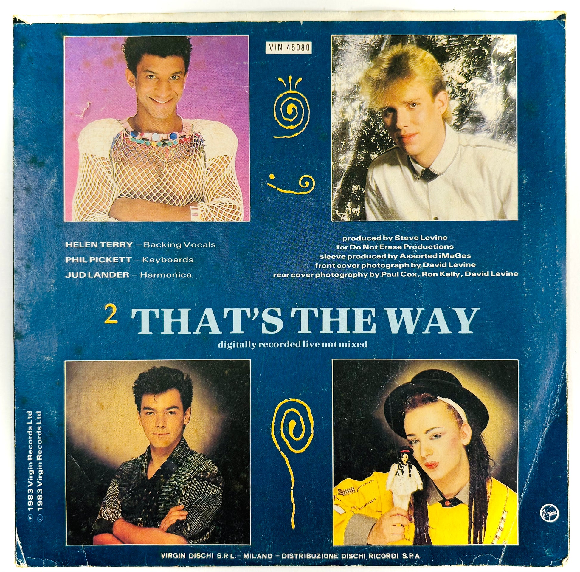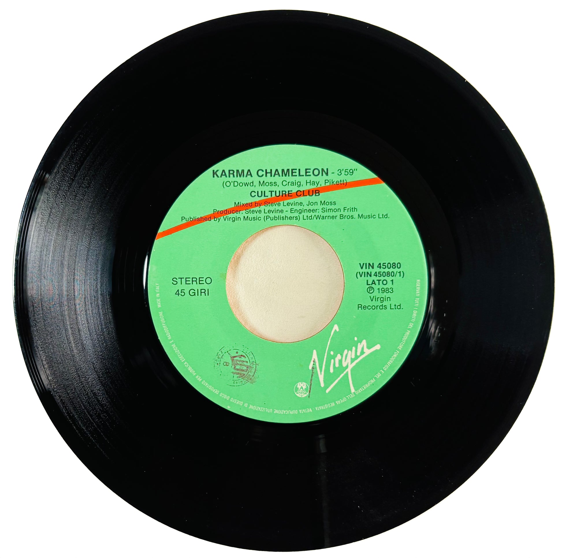 Catalogo (Catalog): VIN 45080. Matrice (runout): side A, VS 612 A-3U-1- [AR signature] timtom-cbs VIN-45080 A; side B, VS 612 B 2U-1- VIN-45080 B TY. Virgin, 1983.