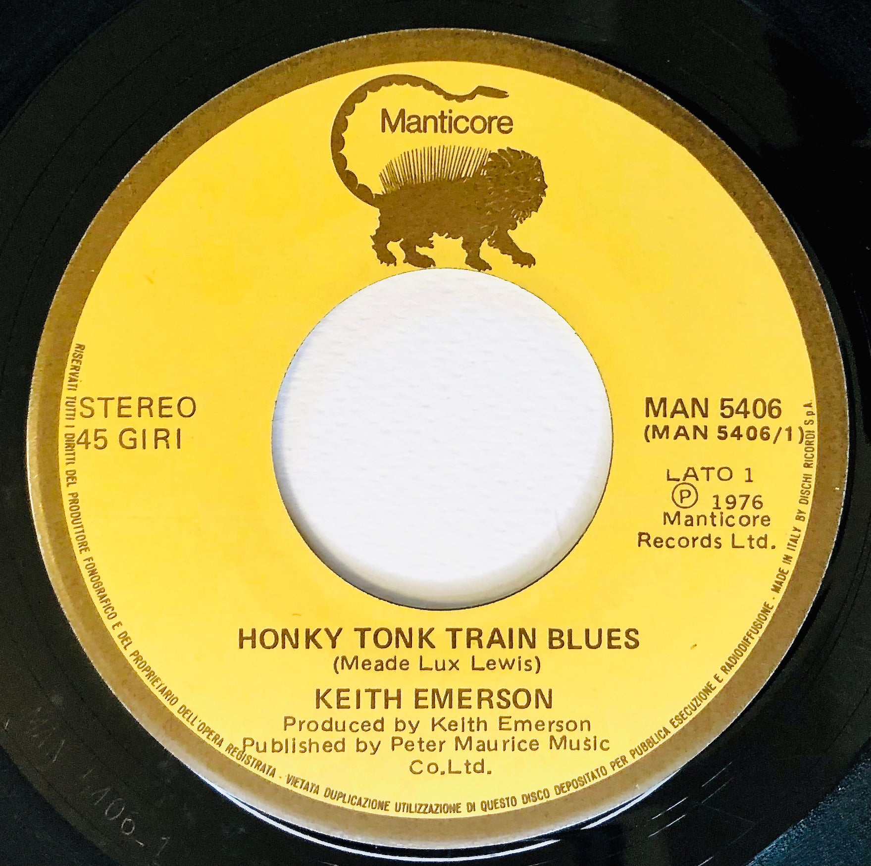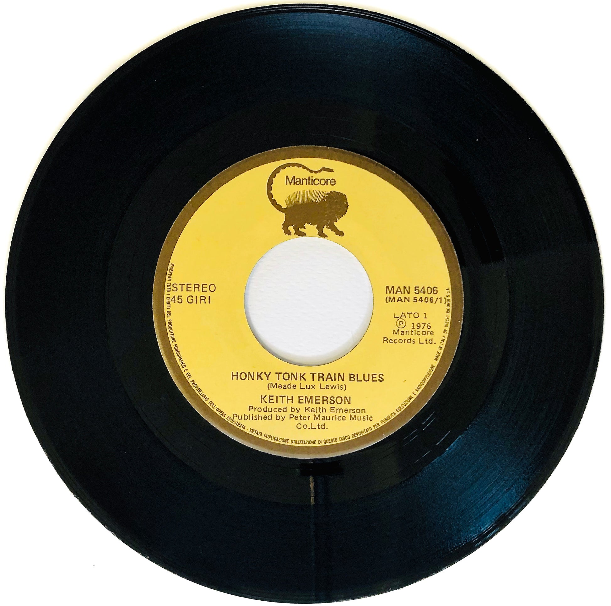 L'ululato del Criceto: Honky Tonk Train Blues è un pezzo per pianoforte del compositore statunitense Meade Lux Lewis, che ha fatto la storia del boogie-woogie e del jazz. Molti artisti lo hanno reinterpretato e arrangiato, e fra questi una delle cover più famose è quella presente in questo raro 45 giri di Keith Emerson degli Emerson, Lake & Palmer, che conobbe un successo strepitoso in Italia nei primi mesi del 1977, quando fu utilizzata come sigla del programma televisivo Odeon. Tutto quanto fa spettacolo su Rai 2. Edizione in vinile 45 giri, per collezionisti!