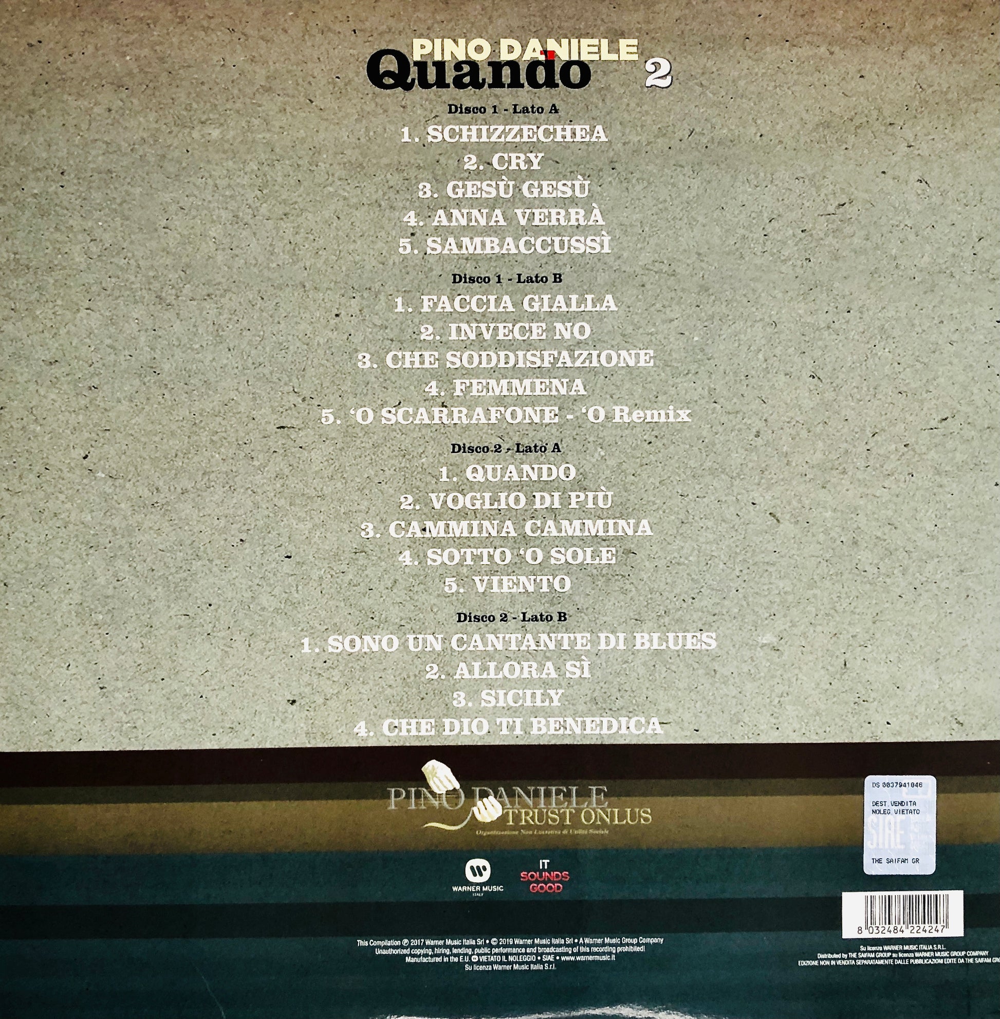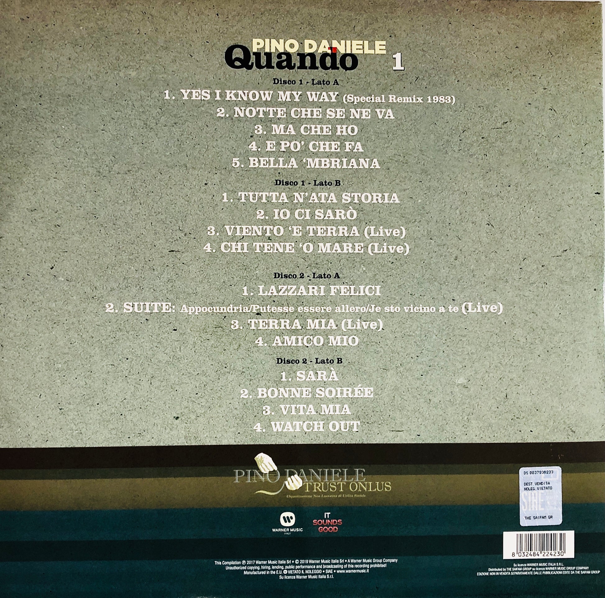 L'ululato del Criceto: una straordinaria collezione in tre doppi vinili curata dall’ente no profit Pino Daniele Trust Onlus per Warner Music Italia. Le tracce audio incluse in “Quando” sono state recuperate dai nastri analogici e digitali originali dei 15 album di Pino Daniele pubblicati da Warner Music, tra i quali: “Vai Mo’- 1981”, “Bella ‘Mbriana – 1983” passando da “Non Calpestare i Fiori Nel Deserto – 1995”, “Dimmi Cosa Succede sulla Terra – 1997” e tanti altri. Quello messo in atto è stato un nuovo e accurato lavoro di rimasterizzazione che ha donato nuova vita sonora a brani incisi più di 30 anni fa, migliorandone il suono senza stravolgerne l’essenza. Presenti versioni live. Magnifica edizione in 6 vinili neri 180 grammi, assolutamente imperdibile!