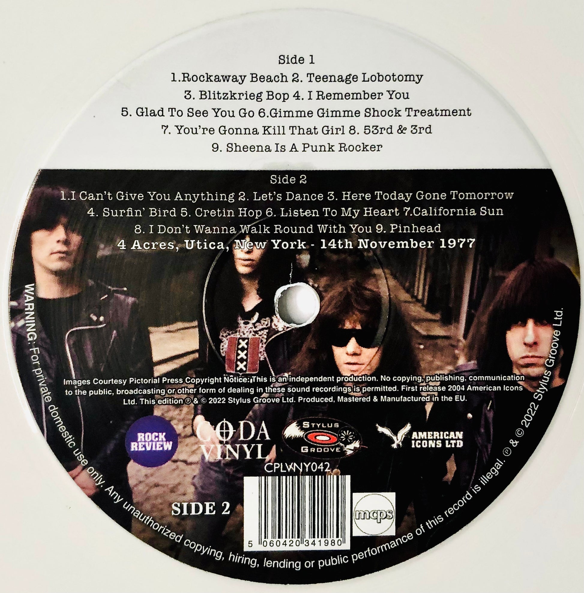 L'ululato del Criceto: imperdibile live broadcast dell’ultima registrazione del gruppo con Tommy Ramone alla batteria. Poco dopo questa performance tenuta a Utica, New York, il 4 novembre 1977, Tommy lasciò il suo ruolo per diventare produttore della band. Questo concerto rappresenta una fantastica riflessione sulla formazione originale dei Ramones al loro culmine, con una scaletta che propone i successi dei primi album. Nuova Edizione Limitata del 2022 in vinile 12-inch colorato bianco con QR code per il download di un esclusivo eBook.